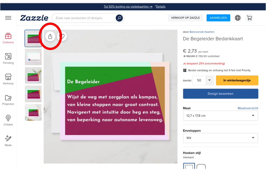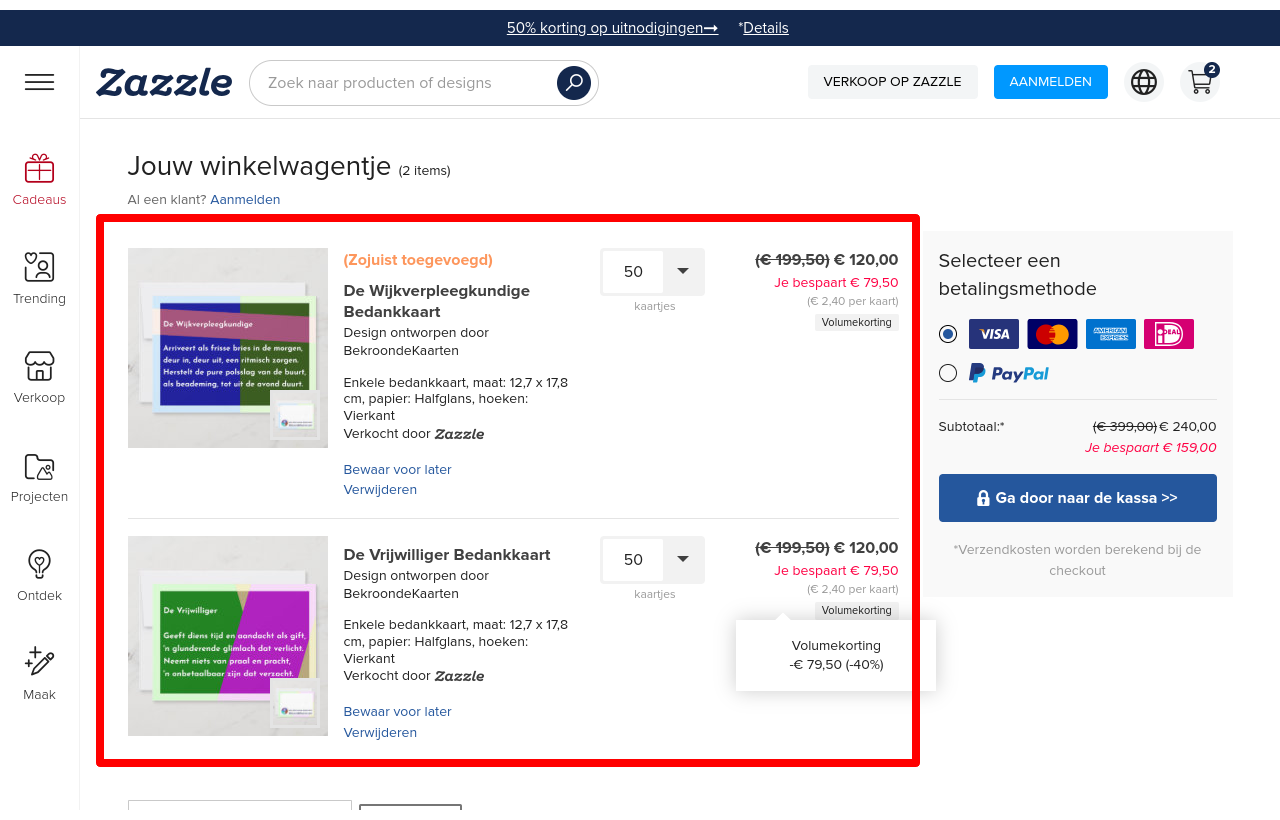 U kunt uw bestelling direct plaatsen of een gevarieerde selectie van Enkele Bedankkaarten maken. Organisaties kunnen er baat bij hebben om verschillende kaarten te kopen in plaats van één ontwerp. De volumekorting is van toepassing op uw totale bestelling, ongeacht de gekozen ontwerpen. U kunt bijvoorbeeld 2×50 kaarten bestellen (bijvoorbeeld 50x De Wijkverpleegkundige en 50x De Vrijwilliger) om 100 kaarten te bemachtigen en te profiteren van de 40% korting. Zie hier een voorbeeld in het winkelwagentje.