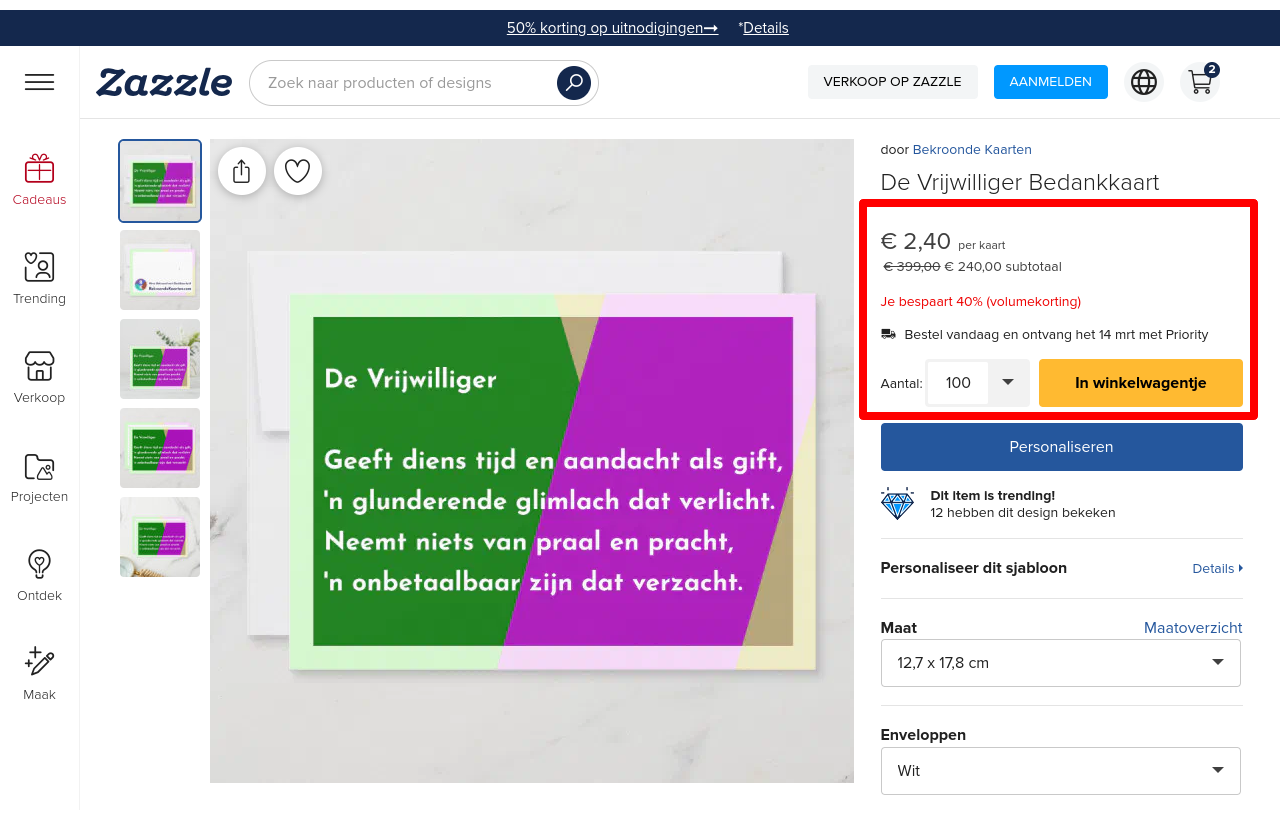 Zazzle biedt regelmatig kortingen op Bekroonde Kaarten, tot wel 50%. Zelfs zonder directe korting op het product, kunt u de prijs per kaart verlagen door een grotere hoeveelheid te kopen. Voor organisaties is dit een interessante optie, aangezien de prijs per kaart daalt door middel van volumekorting. Ter illustratie: