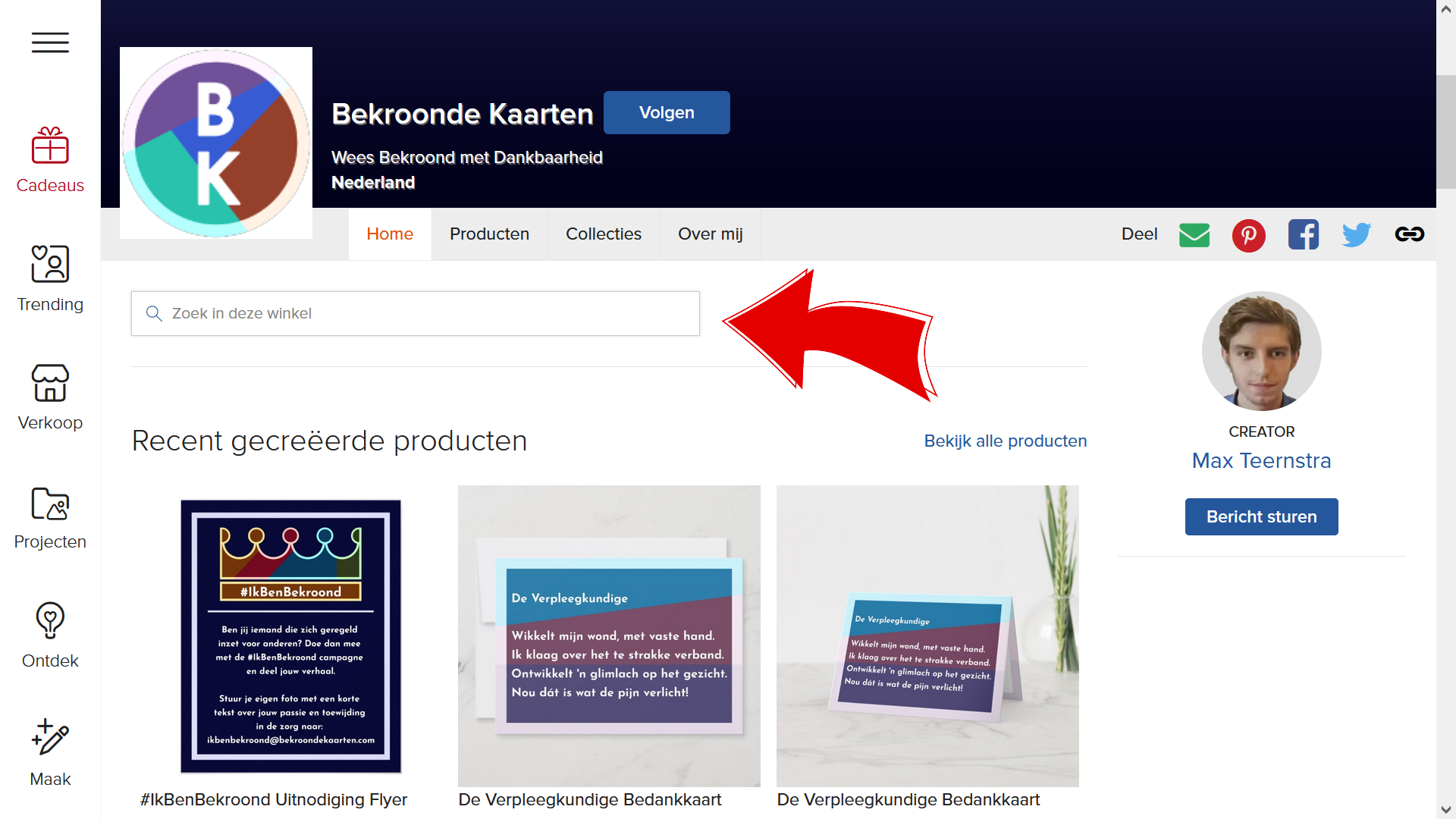 Je kunt dezelfde zoekmethode toepassen op de Bekroonde Kaarten website. Navigeer naar de website en maak gebruik van de zoekfunctie. Hier zie je alle relevante blogberichten. Klik op een bericht voor meer informatie over de bedankkaart en ga vervolgens door naar de Zazzle Winkel.