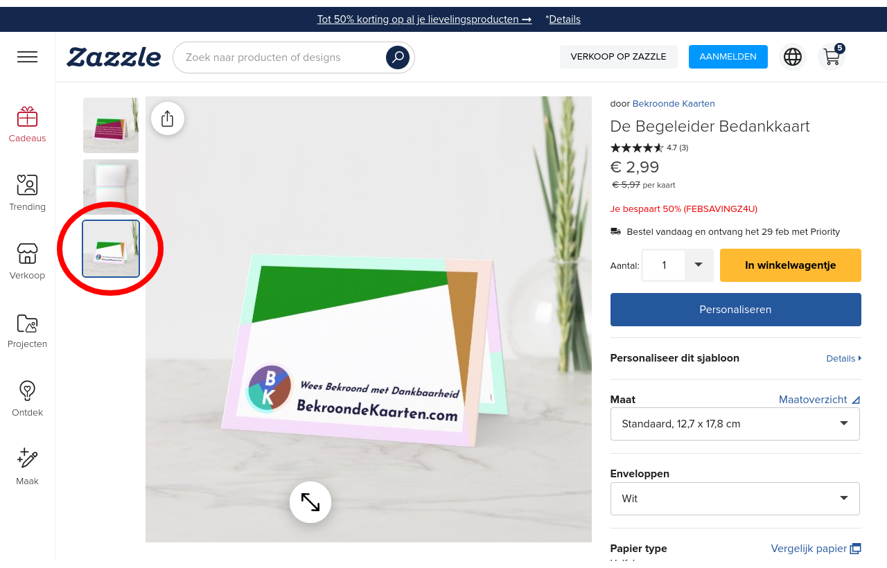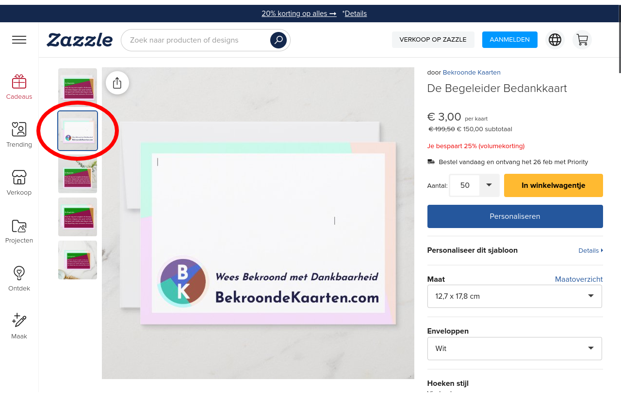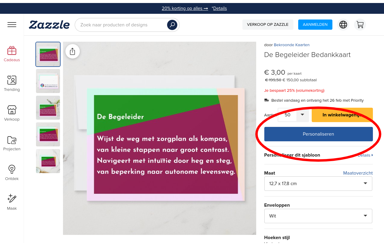 Vervolgens is het tijd om de bestelling te plaatsen door te klikken op de gele knop met de tekst: In winkelwagentje. Je zult merken dat de kaart met jouw aanpassingen in het winkelwagentje wordt geplaatst.