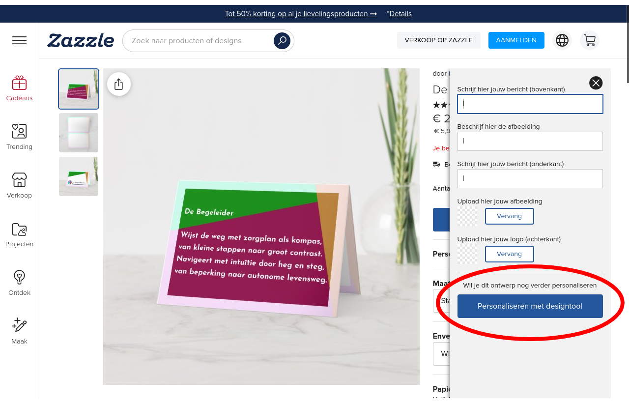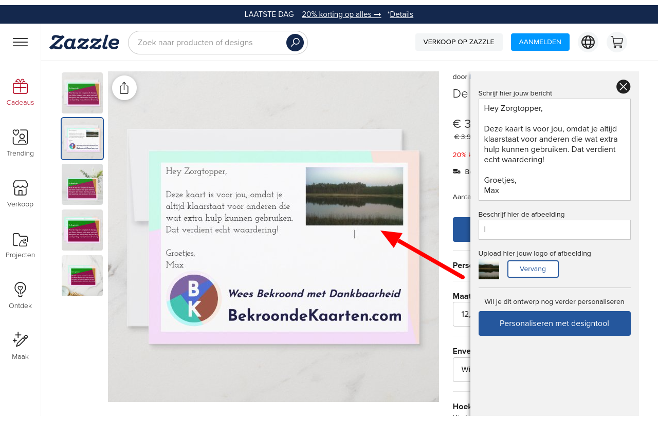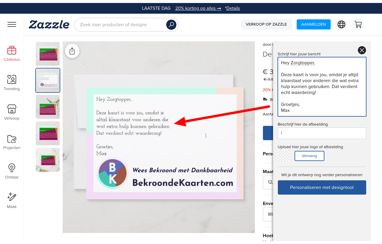 Ten slotte is er ook de mogelijkheid om de bedankkaart verder te personaliseren met de designtool. Door te klikken op de blauwe knop met de tekst: Personaliseren met designtool, kun je mijn sjablonen aanpassen en verplaatsen, extra tekstvlakken toevoegen, afbeeldingen uploaden, en nog veel meer. Het gebruik van deze designtool vereist echter enige kennis en ervaring. Hoewel je veel kunt bereiken, bestaat er ook de kans op fouten. Daarom raad ik aan om deze optie alleen te gebruiken als je echt iets wilt veranderen wat niet mogelijk is met het simpele bewerkingsmenu.