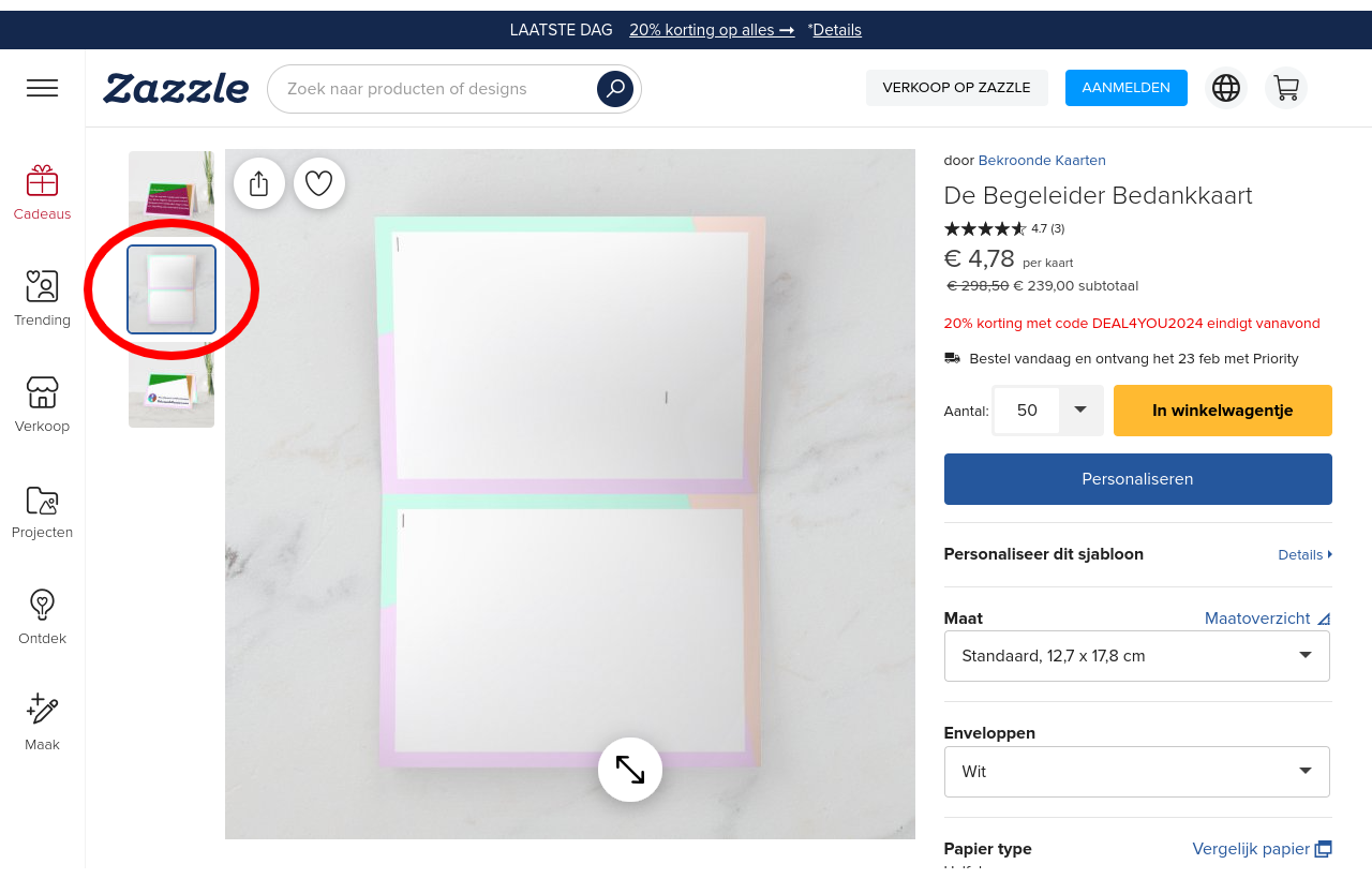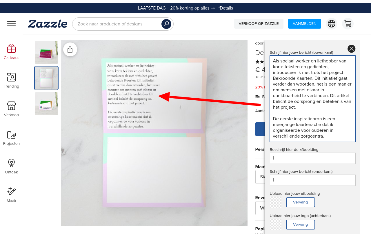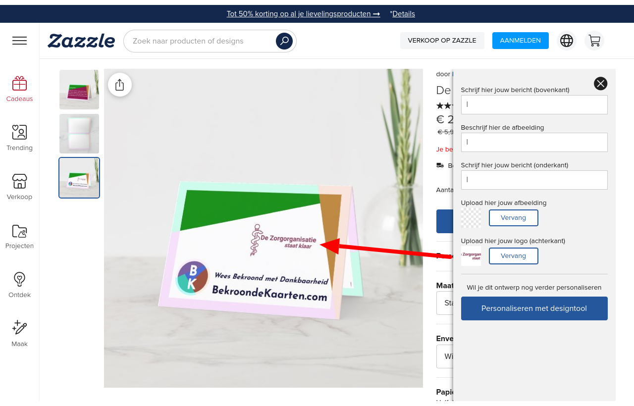 Ten slotte is er ook de mogelijkheid om de bedankkaart verder te personaliseren met de designtool. Door te klikken op de blauwe knop met de tekst: Personaliseren met designtool, kun je mijn sjablonen aanpassen en verplaatsen, extra tekstvlakken toevoegen, afbeeldingen uploaden, en nog veel meer. Het gebruik van deze designtool vereist echter enige kennis en ervaring. Hoewel je veel kunt bereiken, bestaat er ook de kans op fouten. Daarom raad ik aan om deze optie alleen te gebruiken als je echt iets wilt veranderen wat niet mogelijk is met het simpele bewerkingsmenu.