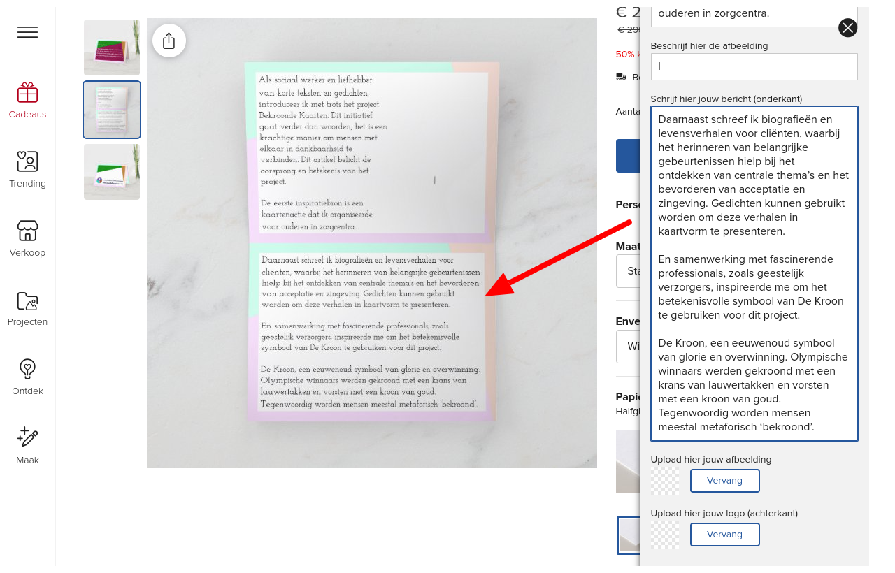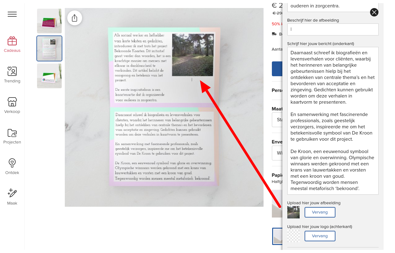 Voordat je begint met bewerken, is het raadzaam om de tweede foto van de kaart te selecteren. Hier zal je tekst verschijnen terwijl je typt, en je afbeelding zodra je deze uploadt.