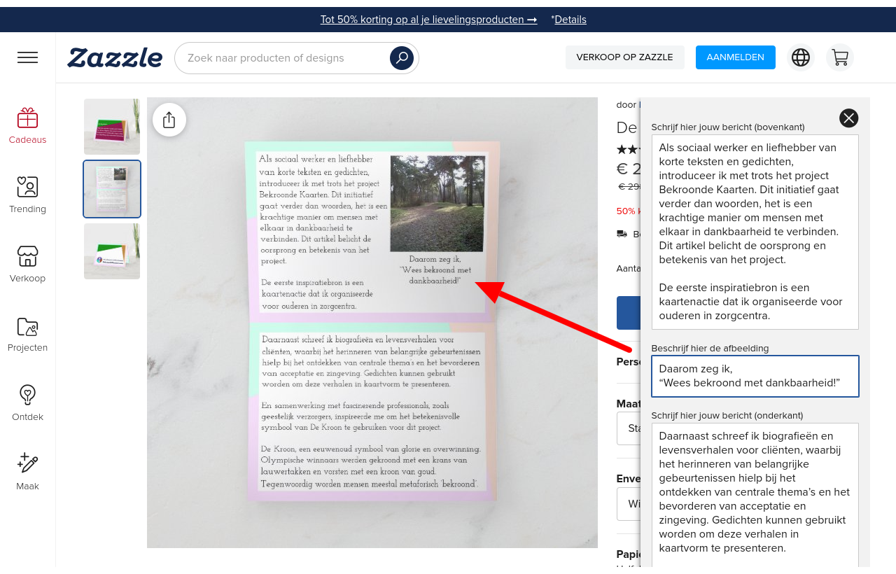 Alle bedankkaarten van Bekroonde Kaarten zijn zorgvuldig ontworpen om jou de vrijheid te geven ze te personaliseren met afbeeldingen en teksten. Deze aanpassingen kunnen gemakkelijk worden gedaan in de Zazzle Winkel voordat je je bestelling plaatst. Zowel particulieren als organisaties zijn van harte welkom om hiervan gebruik te maken.