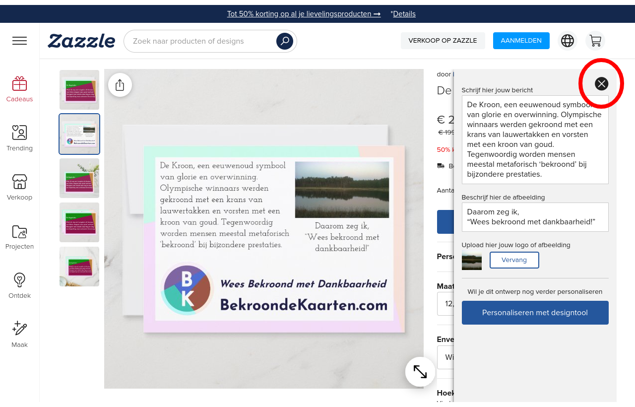 Nu je klaar bent met het personaliseren van de bedankkaart, kun je het bewerkingsmenu sluiten. Je wijzigingen zullen worden opgeslagen.
